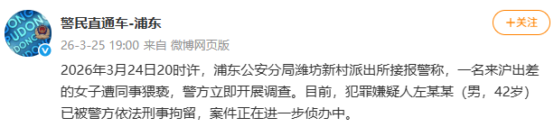 3月25日晚间,上海浦东公安发布警情通报:2026年3月24日20时许,浦东公安分局潍坊新村派出所接报警称,一名来沪出差的女子遭同事猥亵,警方立即开展调查。目前,犯罪嫌疑人左某某(男,42岁)已被警方依法刑事拘留,案件正在进一步侦办中。